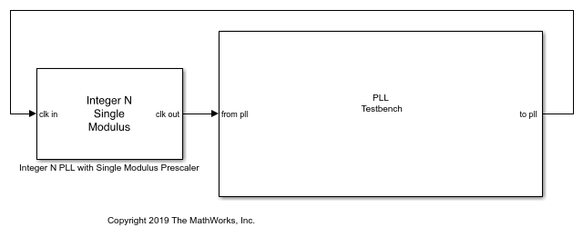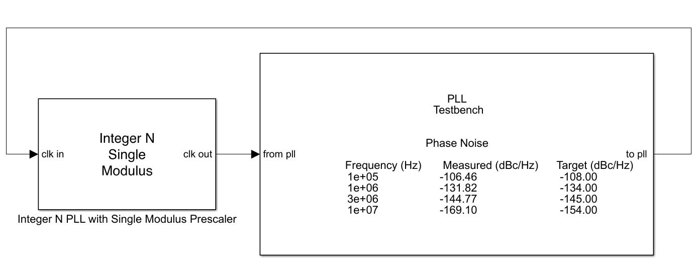 Open the model simplePLL attached to this example as a supporting file. The model consists of an Integer N PLL with Single Modulus Prescaler block and a PLL Testbench block.