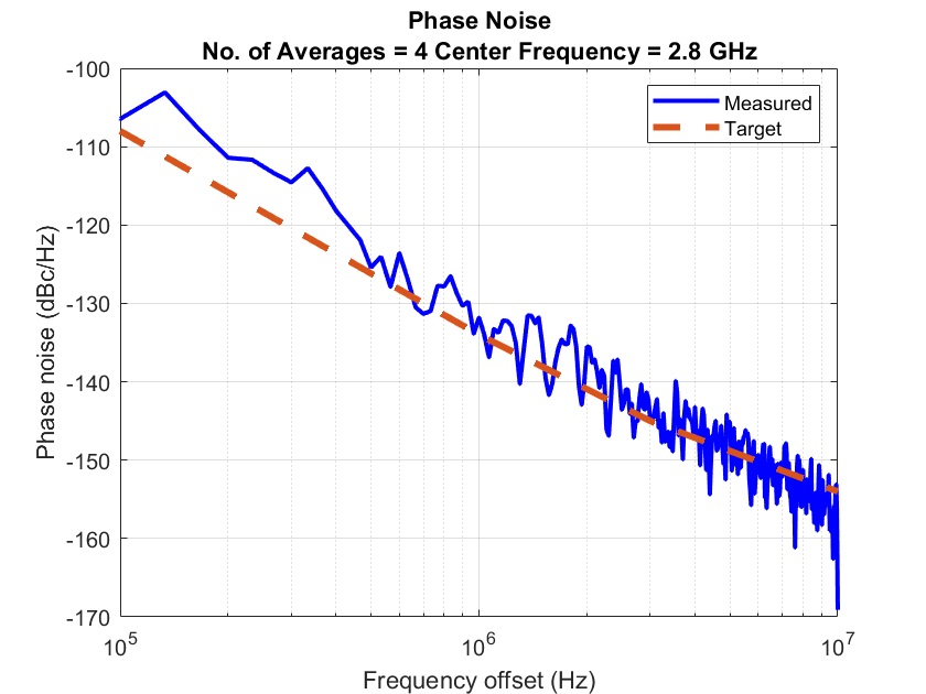 Double-click the PLL Testbench block to open the Block Parameters dialog box. Click the Plot phase noise profile button. The PLL operating frequency is 2.8 GHz, and the measured phase noise profile matches the target profile.