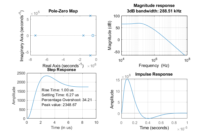 The closed loop analysis consists of the Pole-Zero Map, Magnitude Response, Step Response, and Impulse Response. The 3-dB bandwidth of the system is 288.51 kHz. The system is stable.