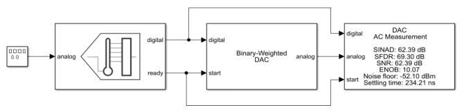 The DAC AC Measurement block measures DAC AC performance metrics such as signal-to-noise ratio (SNR), signal to noise and distortion radio (SINAD), spurious-free dynamic range (SFDR), effective number of bits (ENOB), and noise floor. You can use DAC AC Measurement block to validate the DAC architecture models provided in Mixed-Signal Blockset™, or you can use a DAC of your own implementation