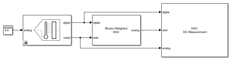 Open the model dac_dc_measure. The model consists of a Signal Generator, a Flash ADC, a Binary Weighted DAC block, and a DAC AC Measurement block.