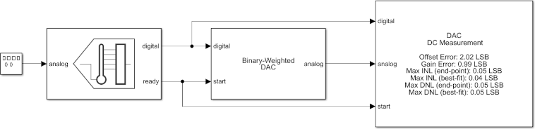 The DAC DC Measurement block measures DAC DC performance metrics such as offset error, gain error, integral nonlinearity (INL), and differential nonlinearity (DNL) errors. You can use the DAC DC Measurement block to validate the DAC architecture models provided in Mixed-Signal Blockset™, or you can use a DAC of your own implementation.