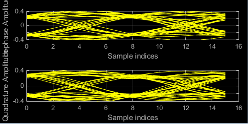 The Eye Diagram block displays multiple traces of a modulated signal to produce an eye diagram. You can use the block to reveal the modulation characteristics of the signal, such as the effects of pulse shaping or channel distortions.