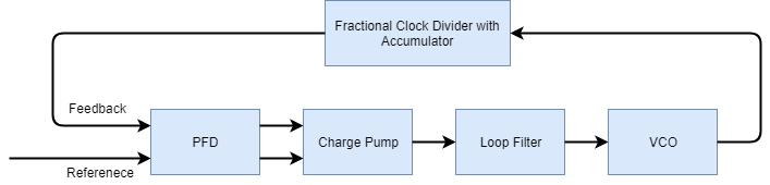 The Fractional N PLL with Accumulator reference architecture uses a Fractional Clock Divider with Accumulator block as the frequency divider in a PLL system. The frequency divider divides the frequency of the VCO output signal by a fractional value to make it comparable to a PFD reference signal frequency.