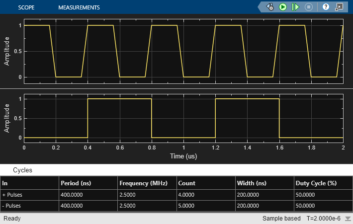 Run the simulation for 2e-6 s. The frequency of the output signal is 1.25 MHz.