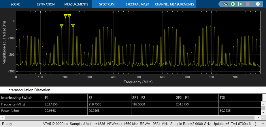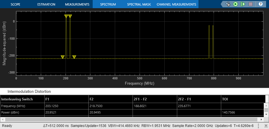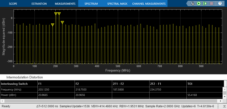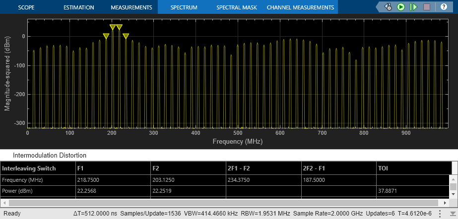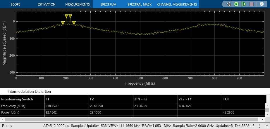 set_param(model + "/ADC_1 at 1G SPS", "jitter", "off"); set_param(model + "/ADC_1 at 1G SPS", "nonlinearity", "off"); set_param(model + "/ADC_1 at 1G SPS", "quantization", "off"); set_param(model + "/ADC_2 at 1G SPS", "jitter", "off"); set_param(model + "/ADC_2 at 1G SPS", "nonlinearity", "off"); set_param(model + "/ADC_2 at 1G SPS", "quantization", "off"); set_param(model + "/Offset Delay", "DelayTime", ".5/Fs_adc"); set_param(model + "/Two Tone Sine Wave", "Amplitude", ".5"); set_param(model + "/Two Tone Sine Wave", "Frequency", "2*pi*[203.125, 218.750]*1e6"); set_param(model + "/Input Switch", "sw", "1"); scopeConfig = get_param(model + "/Spectrum Analyzer", "ScopeConfiguration"); scopeConfig.DistortionMeasurements.Type = "intermodulation";