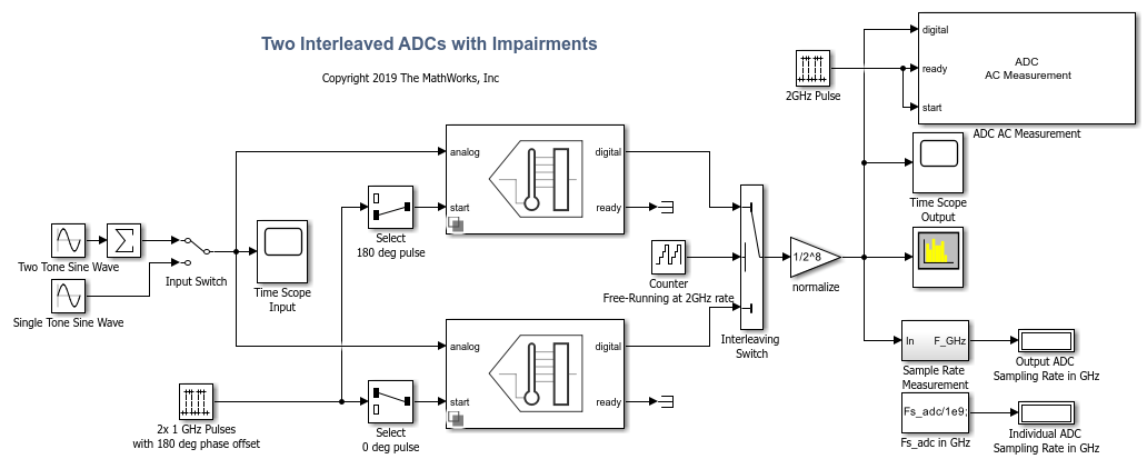 Each ADC operates at 1 GHz rate, set by the MATLAB® variable Fs_adc defined in the initialization callback of this model. The operating rate of the ADCs is indicated by the green signals and blocks in the diagram. The input signal of the second ADC is delayed by an amount equal to half a period of the ADC sampling frequency.