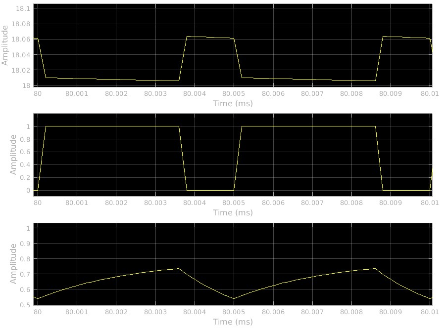 The first choice offered is the Simulink PWM block, which reads the output pulse width from the control input on the rising edge of the output pulse. To use this PWM, set the manual switches Switch 1 and Switch 2 in the model to their upper positions. Run this model and compare the steady state outputs of the power train output and the compensator to the output of the PWM. Note that the steady state duty cycle of 0.7355 occurs near the beginning of the ripple cycle and that the ripple voltage increases from there.