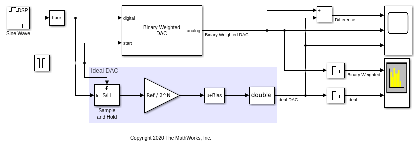 This example shows a comparison of the Binary Weighted DAC from the Mixed-Signal Blockset™ to an ideal DAC model.