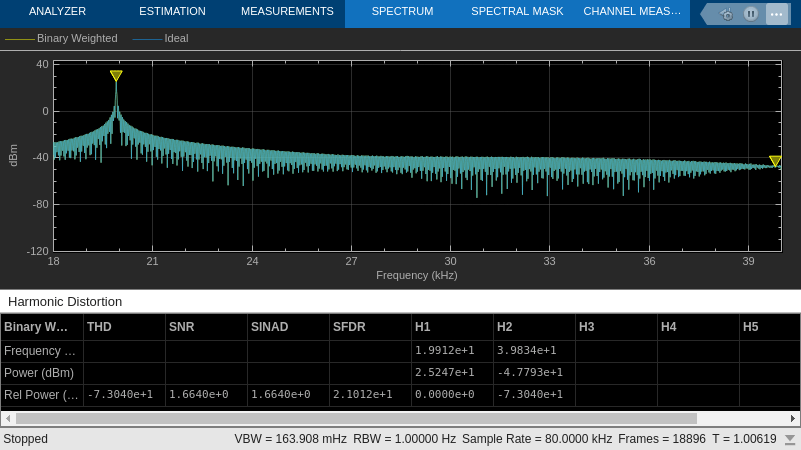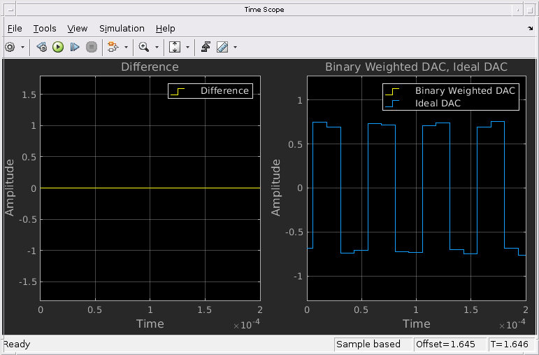 The Binary Weighted DAC outputs a scalar double. The outputs of both the Binary Weighted DAC and the ideal DAC produce values on the interval [-Ref, Ref - 1 LSB] / 2.