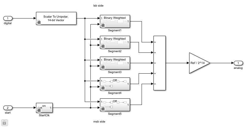 The Logical Vector Conversion block splits the input word into its component bits. Inside each segment a Selector block picks the subset of the input word for that segment and another Logical Vector Conversion block converts it back to a scalar value for the segment DAC to convert. The individual segment DACs are Binary Weighted DAC blocks. Their parameter settings are set during model initialization by the Segmented DAC block. Finally, the segments' outputs are added and scaled to the reference of the Segmented DAC block.