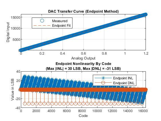 Double click the DAC Testbench block to open the Block Parameters dialog box. Click the Plot DC analysis results button to view the DAC transfer curve, endpoint nonlinearity and best fit nonlinearity.