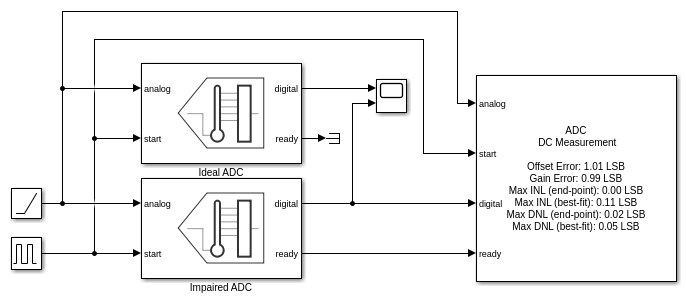 The ADC DC Measurement block confirms the values of the impairments to within a margin of error determined by the sample rate of the system. The offset error and gain error were both entered as 1 LSB. Offset error was measured as 1.08 LSB and gain error was measured as 0.97 LSB. Errors in these measurements are due to the converter not sampling exactly at its threshold values. The maximum expected error in LSB is: