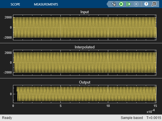 Use the Spectrum Analyzer to compare the low-sample rate input to the output of the oversampled interpolating DAC. The gain block next to the Spectrum Analyzer matches the input wave to the amplitude of the DAC's output for side-by-side comparison.