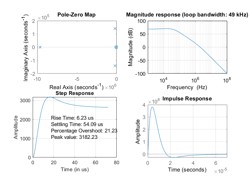 Verify the closed and open loop performance of the PLL with this implementation of the loop filter. The resulting phase margin is 55 degrees. The phase margin along with the pole zero locations confirm the stability of the PLL.