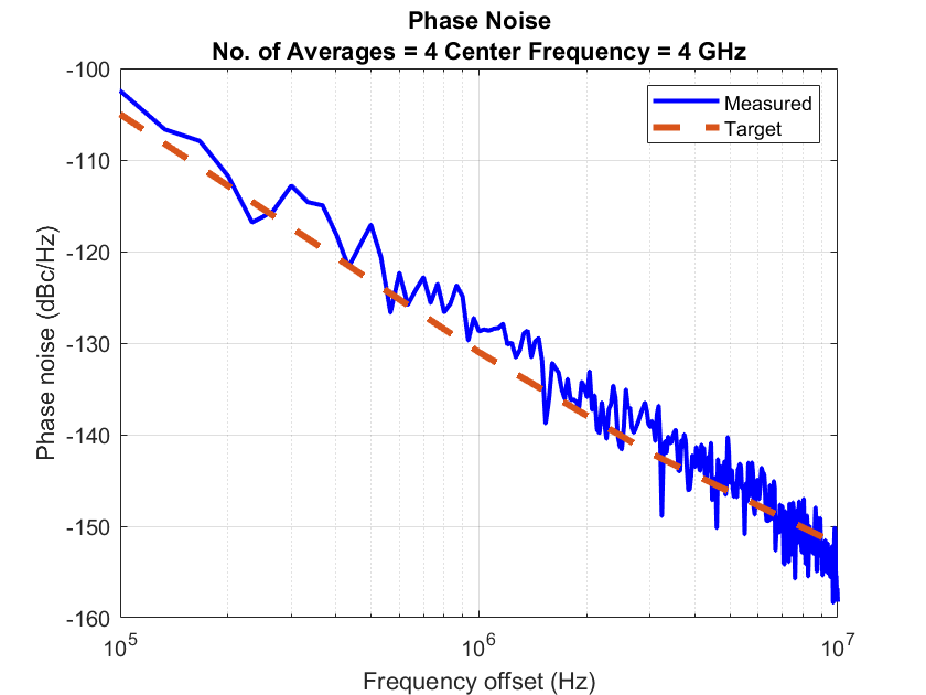 In this case, the simulation takes a few minutes. To speed up simulation time, you can relax the settings for measuring the phase noise. For example, use a larger resolution bandwidth or reduce the number of spectral averages.