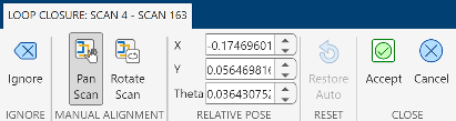 | Click Incremental Match to modify the relative pose of the currently selected frame and align the scan with the previous scan. Click Loop Closure to modify or ignore the detected loop closure for the current frame. Use the slider on the bottom to scroll back to areas where scan matching or loop closures are not accurate. You can modify any number of scans or loop closures. For more information, see Modify Increment Scans and Loop Closures. |