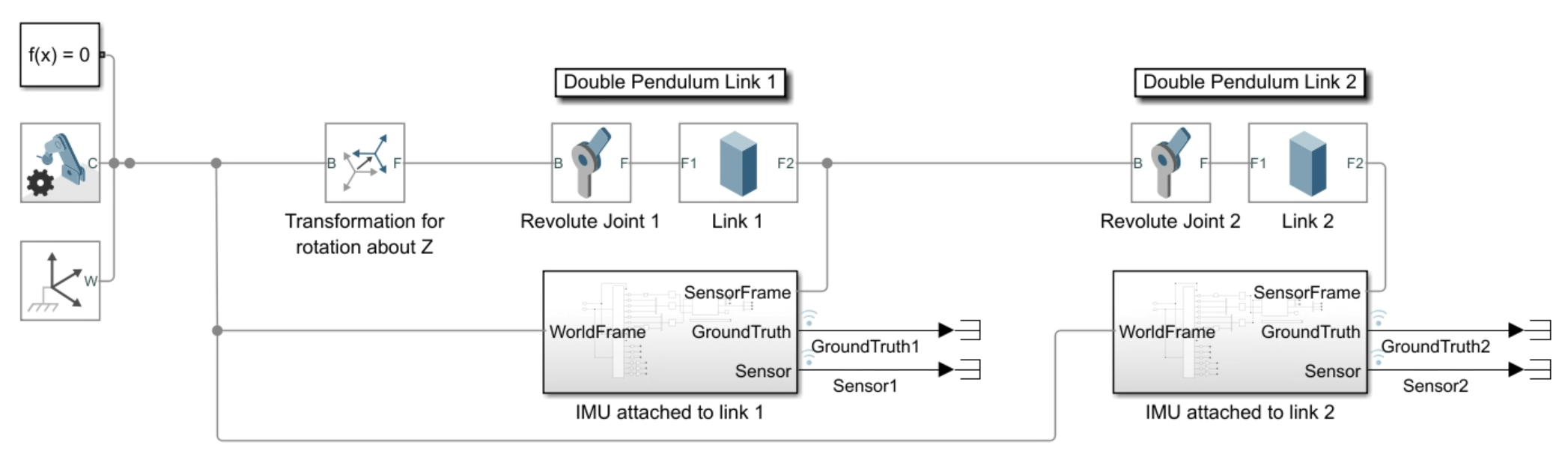 This example shows how to generate inertial measurement unit (IMU) readings from two IMU sensors mounted on the links of a double pendulum. The double pendulum is modeled using Simscape™ Multibody™. For a step-by-step example of building a simple pendulum using Simscape Multibody, see Model a Simple Pendulum (Simscape Multibody).