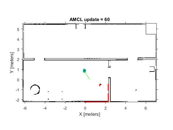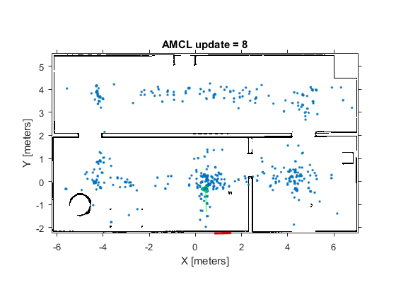 The AMCL algorithm is updated with odometry and sensor readings at each time step when the robot is moving around. Allow a few seconds before particles are initialized and plotted in the figure. In this example we will run numUpdates AMCL updates. If the robot doesn't converge to the correct robot pose, consider using a larger numUpdates.