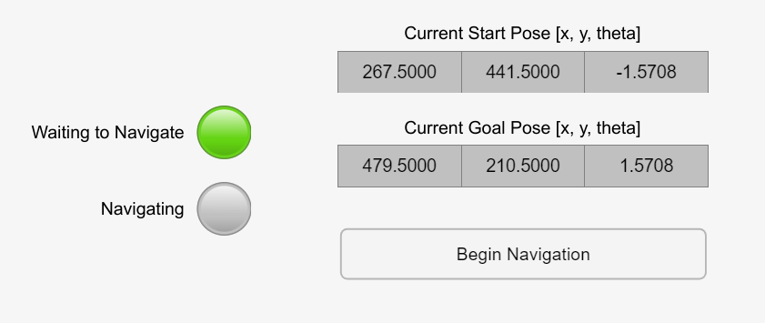 startPose = [267.5 441.5 -pi/2]; % [x,y,theta] goalPose = [479.5 210.5 pi/2]; % [x,y,theta] initialTranslationTruck = [(startPose(1:2)-mapSize/2) mapHeight.getMapData(startPose(1:2))-zOffset+8]; initialRotationTruck = [startPose(3) 0 0];