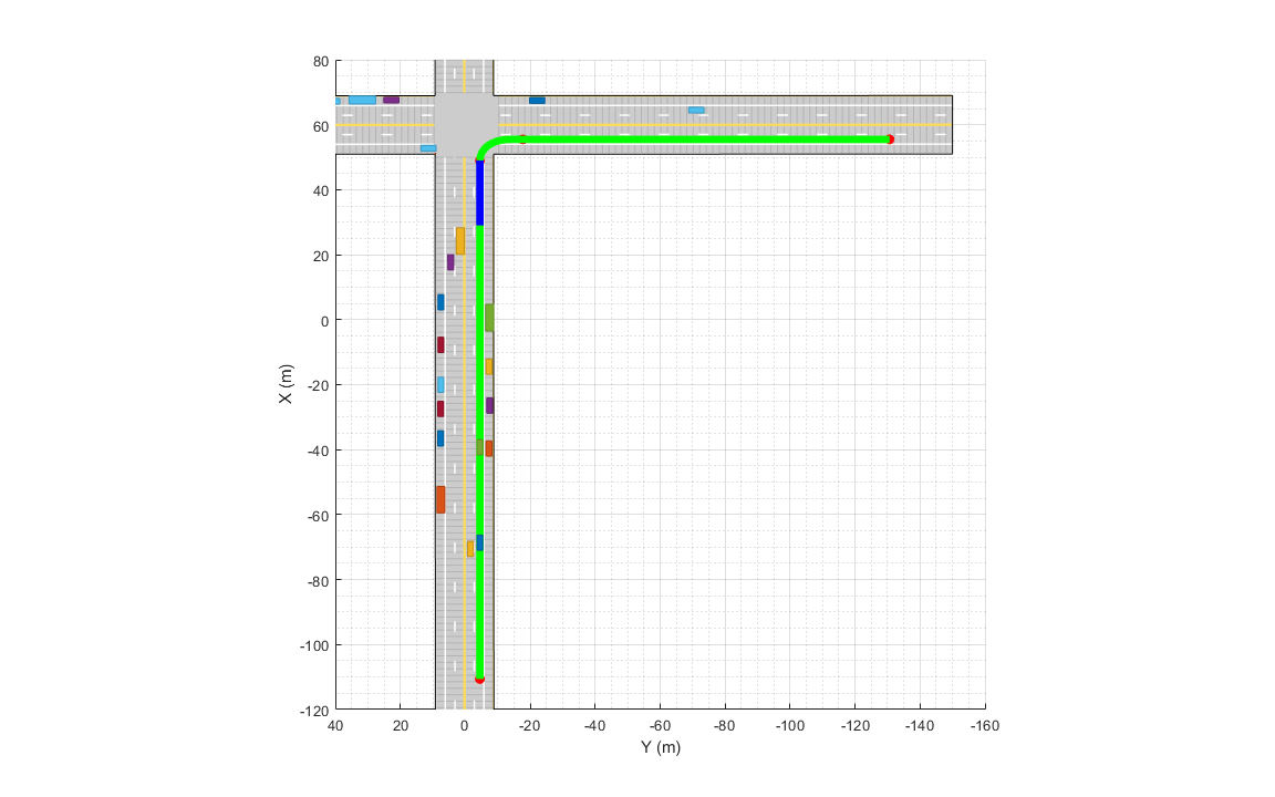 % Visualize path regions for sampling strategy visualization pathPoints = closestPoint(refPath, refPath.Waypoints(:,1:2)); roadS = pathPoints(:,end); intersectionS = roadS(2,end); intersectionBuffer = 20; pathGreen = [interpolate(refPath,linspace(0,intersectionS-intersectionBuffer,20));... nan(1,6);... interpolate(refPath,linspace(intersectionS,roadS(end),100))]; pathBlue = interpolate(refPath,linspace(intersectionS-intersectionBuffer,roadS(2,end),20)); hold(ax,'on'); plot(ax,pathGreen(:,1),pathGreen(:,2),'Color',[0 1 0],'LineWidth',5); plot(ax,pathBlue(:,1),pathBlue(:,2),'Color',[0 0 1],'LineWidth',5);