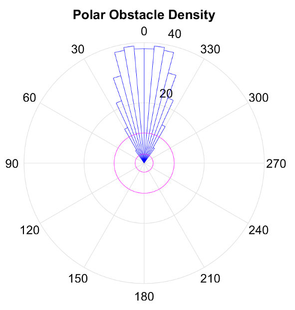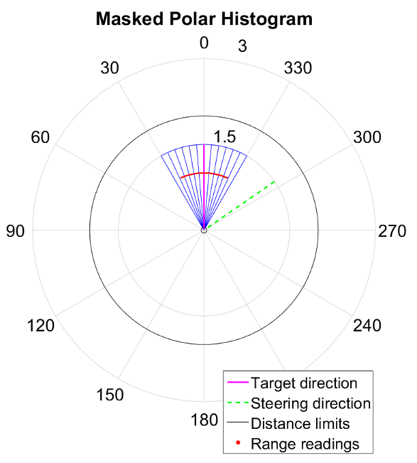 The polar density plot has the following corresponding masked histogram plot. This plot shows the target and steering directions, range readings, and distance limits.