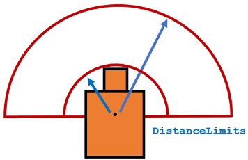 DistanceLimitsspecifies the distance range that you want to consider for obstacle avoidance. You specify the limits in a two-element vector,[lower upper]. Thelowerlimit is used to ignore sensor readings that intersect with parts on the robot, sensor inaccuracies at short distances, or sensor noise. Theupperlimit is the effective range of the sensor or is based on your application. You might not want to consider all obstacles in the full sensor range.