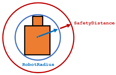 SafetyDistanceoptionally specifies an added distance on top of theRobotRadius. You can use this property to add a factor of safety when navigating an environment.