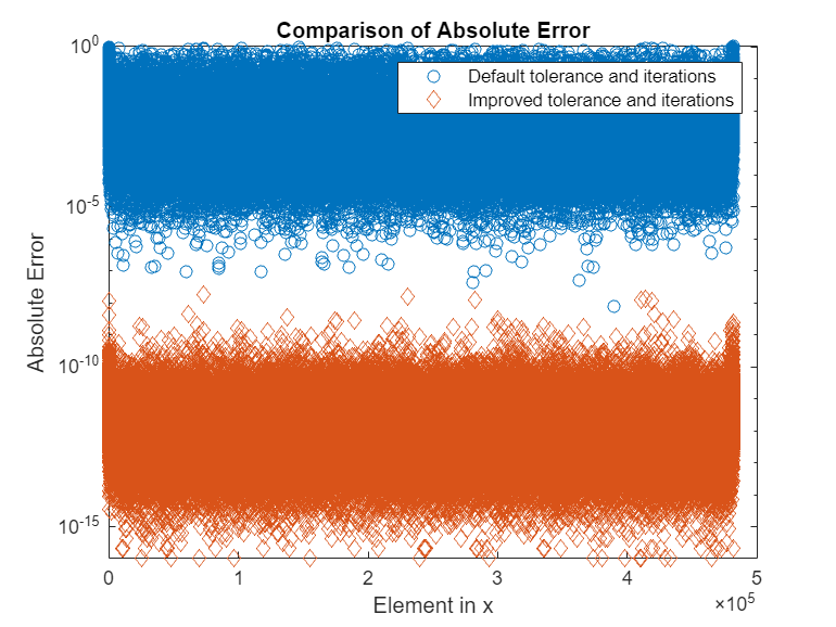 errCG_2 = abs(xExact-xCG_2); figure(2) hold off semilogy(errCG_1,'o'); hold on semilogy(errCG_2,'d'); title('Comparison of Absolute Error'); ylabel('Absolute Error'); xlabel('Element in x'); legend('Default tolerance and iterations','Improved tolerance and iterations'); hold off
