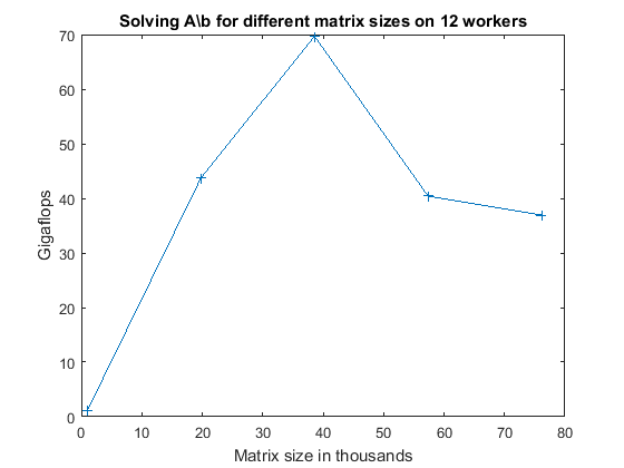 fig = figure; ax = axes('parent', fig); plot(ax, matSize/1000, gflops); lines = ax.Children; lines.Marker = '+'; ylabel(ax, 'Gigaflops') xlabel(ax, 'Matrix size in thousands') titleStr = sprintf(['Solving A\\b for different matrix sizes on ' ... '%d workers'], poolSize); title(ax, titleStr, 'Interpreter', 'none');