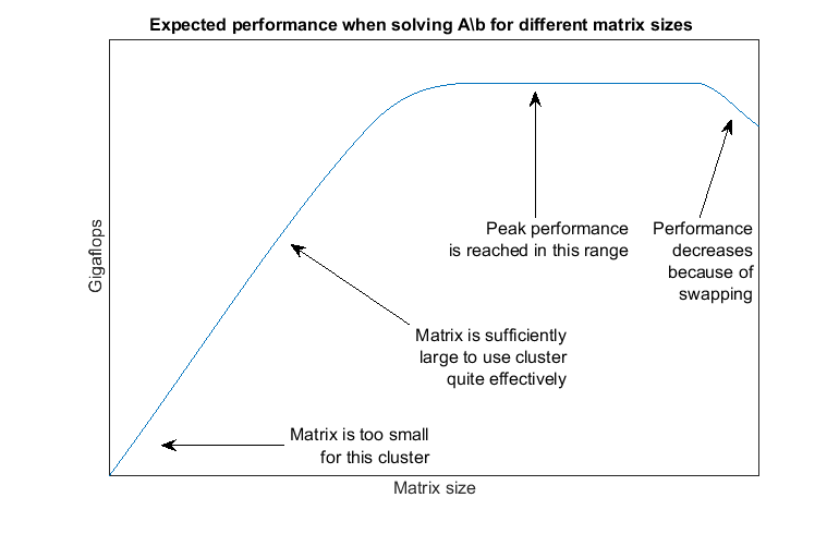 We use the number of floating point operations per second as our measure of performance because that allows us to compare the performance of the algorithm for different matrix sizes and different number of workers. If we are successful in testing the performance of matrix left division for a sufficiently wide range of matrix sizes, we expect the performance graph to look similar to the following: