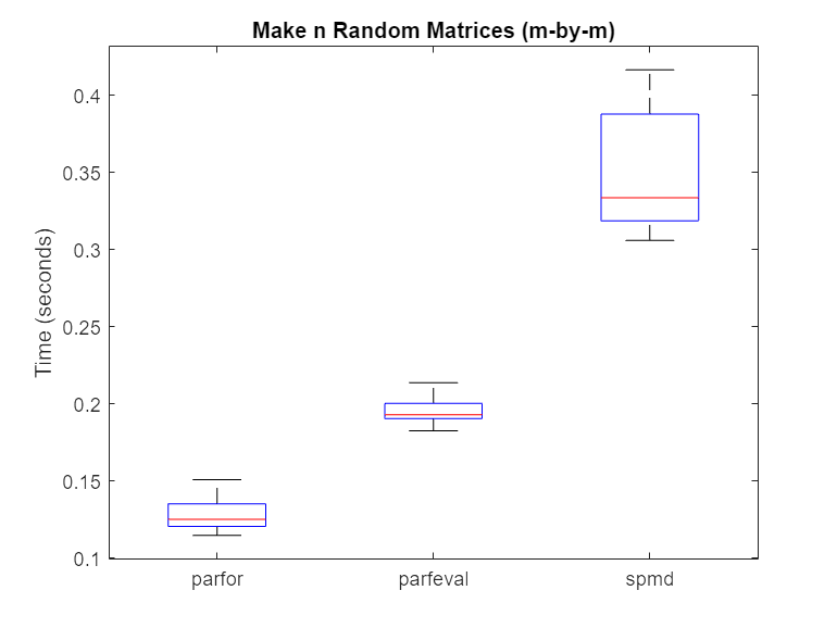 % Hide outliers boxData = rmoutliers([parforTime parfevalTime spmdTime]); % Plot data boxplot(boxData, 'labels',{'parfor','parfeval','spmd'}, 'Symbol','') ylabel('Time (seconds)') title('Make n Random Matrices (m-by-m)')