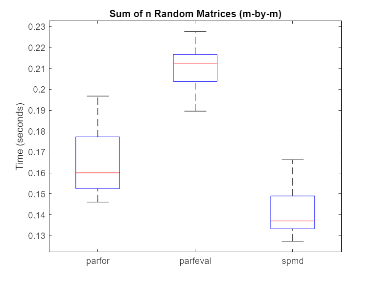 % Hide outliers boxData = rmoutliers([parforTime parfevalTime spmdTime]); % Plot data boxplot(boxData, 'labels',{'parfor','parfeval','spmd'}, 'Symbol','') ylabel('Time (seconds)') title('Sum of n Random Matrices (m-by-m)')