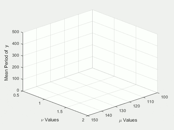 Z = nan(size(N)); c = surf(M, N, Z); xlabel('\mu Values','Interpreter','Tex') ylabel('\nu Values','Interpreter','Tex') zlabel('Mean Period of y') view(137, 30) axis([100 150 0.5 2 0 500]);