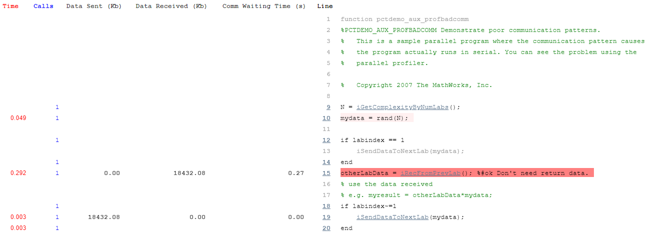 The example code involves explicit communication. In MATLAB® explicit communication is synonymous with directly using Parallel Computing Toolbox™ communication primitives (e.g. spmdSend, spmdReceive, spmdSendReceive, spmdBarrier). Performance problems involving this type of communication, if not related to the underlying hardware, can be difficult to trace. With the parallel profiler many of these problems can be interactively identified. It is important to remember you can separate the various parts of your program into separate functions. This can help when profiling, because some data is collected only for each function.