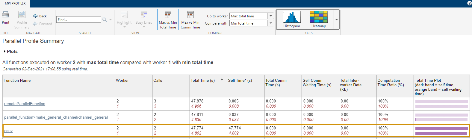 Generally, comparing the workers with the minimum and maximum total execution times is useful. To do so, click Max vs Min Total Time in the report. In this example, observe that conv executes multiple times and takes significantly longer in one worker than in the other. This observation suggests that the load might not be distributed evenly across the workers.