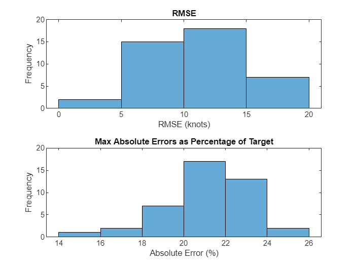 figure nexttile histogram(rootMeanSE) xlabel("RMSE (knots)") ylabel("Frequency") title("RMSE") nexttile histogram(maxRelativeError*100) xlabel("Absolute Error (%)") ylabel("Frequency") title("Max Absolute Errors as Percentage of Target")