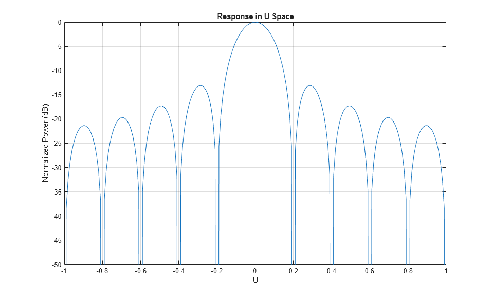 pattern(array,fmax,-1:0.01:1,0,'PropagationSpeed',c, ... 'CoordinateSystem','UV','Type','powerdb') axis([-1 1 -50 0]);