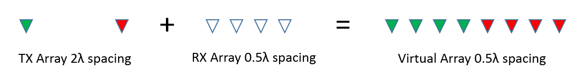 A virtual array can be created by quasi-monostatic MIMO radars, where the transmit and receive arrays are closely located. To better understand the virtual array concept, first look at the two-way pattern of a conventional phased array radar. The two-way pattern of a phased array radar is the product of its transmit array pattern and receive array pattern. For example, consider a 77 GHz millimeter wave radar with a 2-element transmit array and a 4-element receive array.