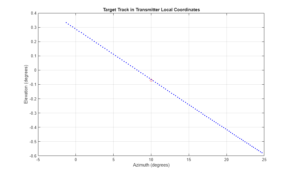 plot(azes1,elevs1,'.b') grid xlabel('Azimuth (degrees)') ylabel('Elevation (degrees)') title('Target Track in Transmitter Local Coordinates') hold on plot(txangsteer(1),txangsteer(2),'or') hold off