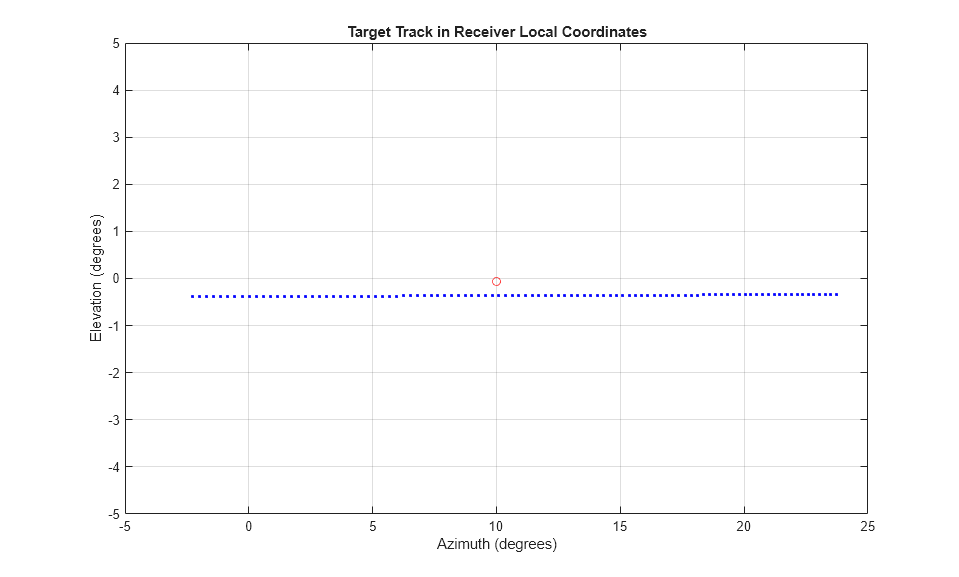 plot(azes2,elevs2,'.b') axis([-5.0,25.0,-5.0,5]) grid xlabel('Azimuth (degrees)') ylabel('Elevation (degrees)') title('Target Track in Receiver Local Coordinates') hold on plot(rxangsteer(1),rxangsteer(2),'or') hold off