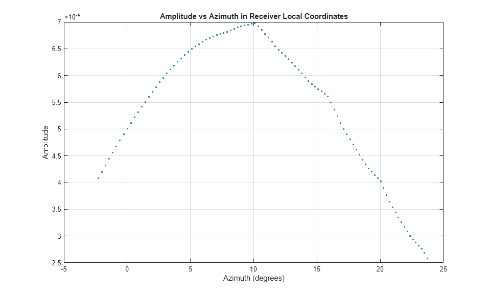 Plot the returned signal amplitude vs azimuth in the receiver local coordinates. The value of the amplitude depends on several factors.