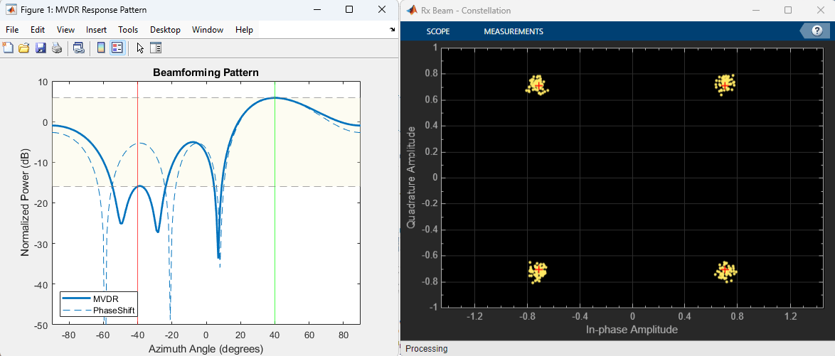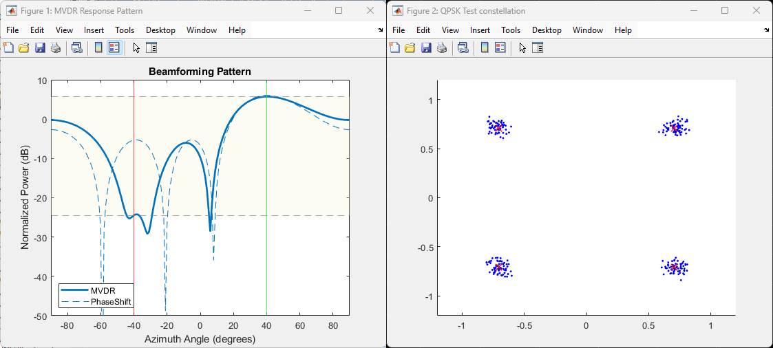 The script generates two plots similar to the simulation, containing the MVDR beamformer response and the QPSK constellation of the received and beamformed signal. The default value of the signal angle is 40 degrees, where the signal is maximum. The angle of the interfering signal is -40 degrees, where the MVDR is adaptively reducing the gain. You can try modifying the parameters in the configuration, such as the interfering angle and signal angle, with different values from the MATLAB script. You can then check the plots if the MVDR algorithm responds to the inputs accordingly.