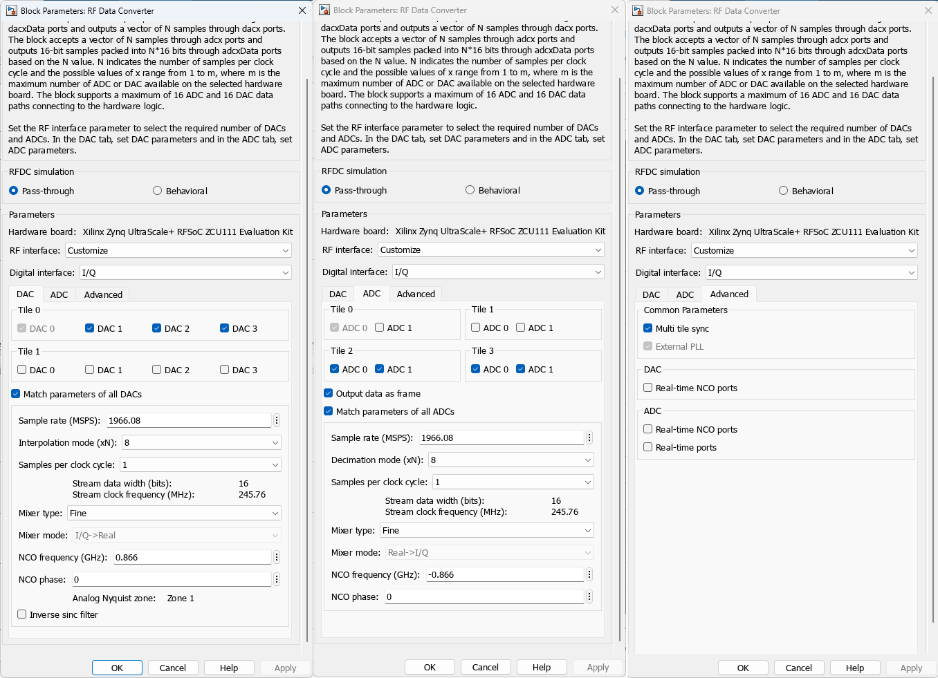 • Set DAC and ADC sample rate to 1966.08e6. This value is the lowest sampling rate satisfying the Nyquist criterion that you can derive from the RF PLL reference on the ZCU111 board.