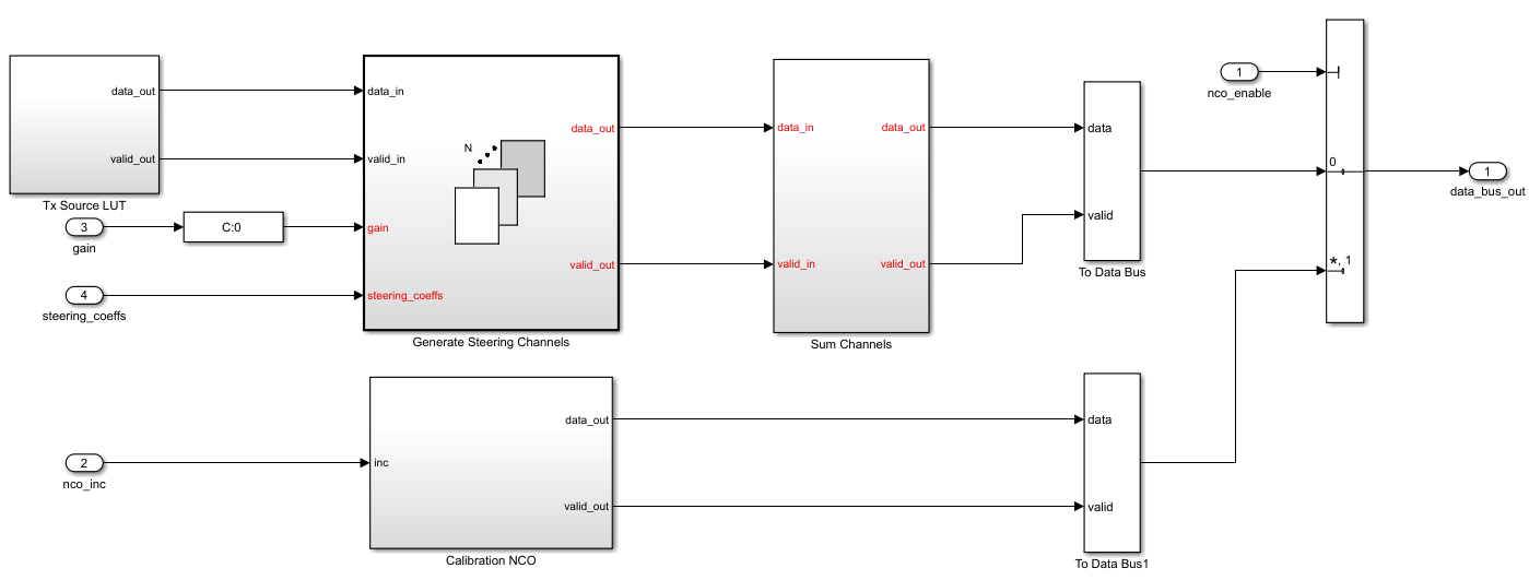 The Tx Signal generation subsystem consists of the Tx Source LUT, Generate Steering Channels, and Calibration NCO subsystems. The Tx Source LUT generates the test signal and the interfering signal. The Generate Steering Channels subsystem generates the steered signal data based on the steering coefficients. The Sum Channels subsystem finally generates samples for each of the DAC channels.