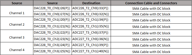 Connect the SMA connectors on the XM500 balun card to complete the loopback between the DAC and ADC channels, according to the connections mentioned in the table below. Since all the selected channels are differential, a DC block is required between the DAC and the ADC P and N connections to block the DC. You require eight loopback cables and eight DC blocks for the four differential channels.