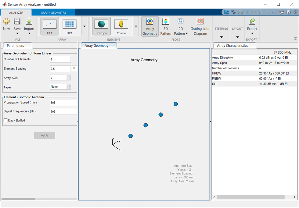 When you type sensorArrayAnalyzer from the command line or select the app from the App Toolstrip, an interactive window opens. The default window shows the geometry of a 4-element uniform linear array. You can then select various options to analyze different arrays, other element types, geometry, and directivity.