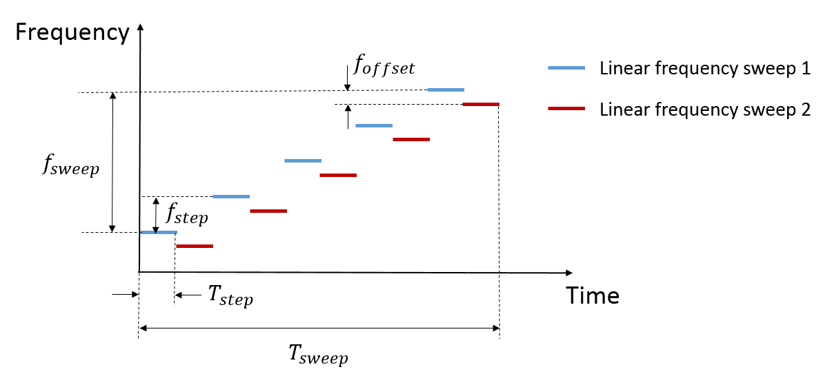 The figure indicates that the MFSK waveform is a combination of two linear FMCW waveforms with a fixed frequency offset. Unlike the regular FMCW waveforms, MFSK sweeps the entire bandwidth at discrete steps. Within each step, a single frequency continuous wave signal is transmitted. Because there are two tones within each step, it can be considered as a frequency shift keying (FSK) waveform. Thus, there is one set of range and Doppler relation from FMCW waveform and another set of range and Doppler relation from FSK. Combining two sets of relations together can help resolve the coupling between range and Doppler regardless of the number of targets present in the scene.