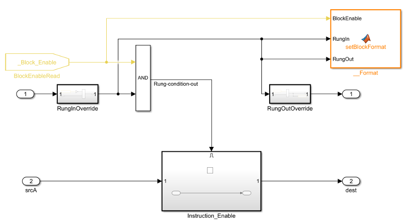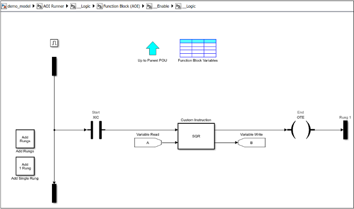 You can create user-defined instructions for your ladder models by using the Custom Instruction block. You can store these blocks containing custom instructions in a user-defined library named plcuserlib.slx. You can also import, simulate, and export your ladder instructions by using your custom blocks.