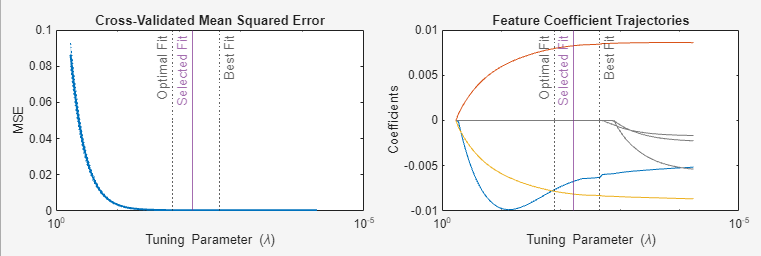 Health Indicator Designer uses the elastic net method, which is related to the lasso algorithm (least absolute shrinkage and selection operator), from the Statistics and Machine Learning Toolbox™ to fit a model to the target. Elastic net regularization is a popular approach for model reduction, as it balances mean squared error and uncertainty.